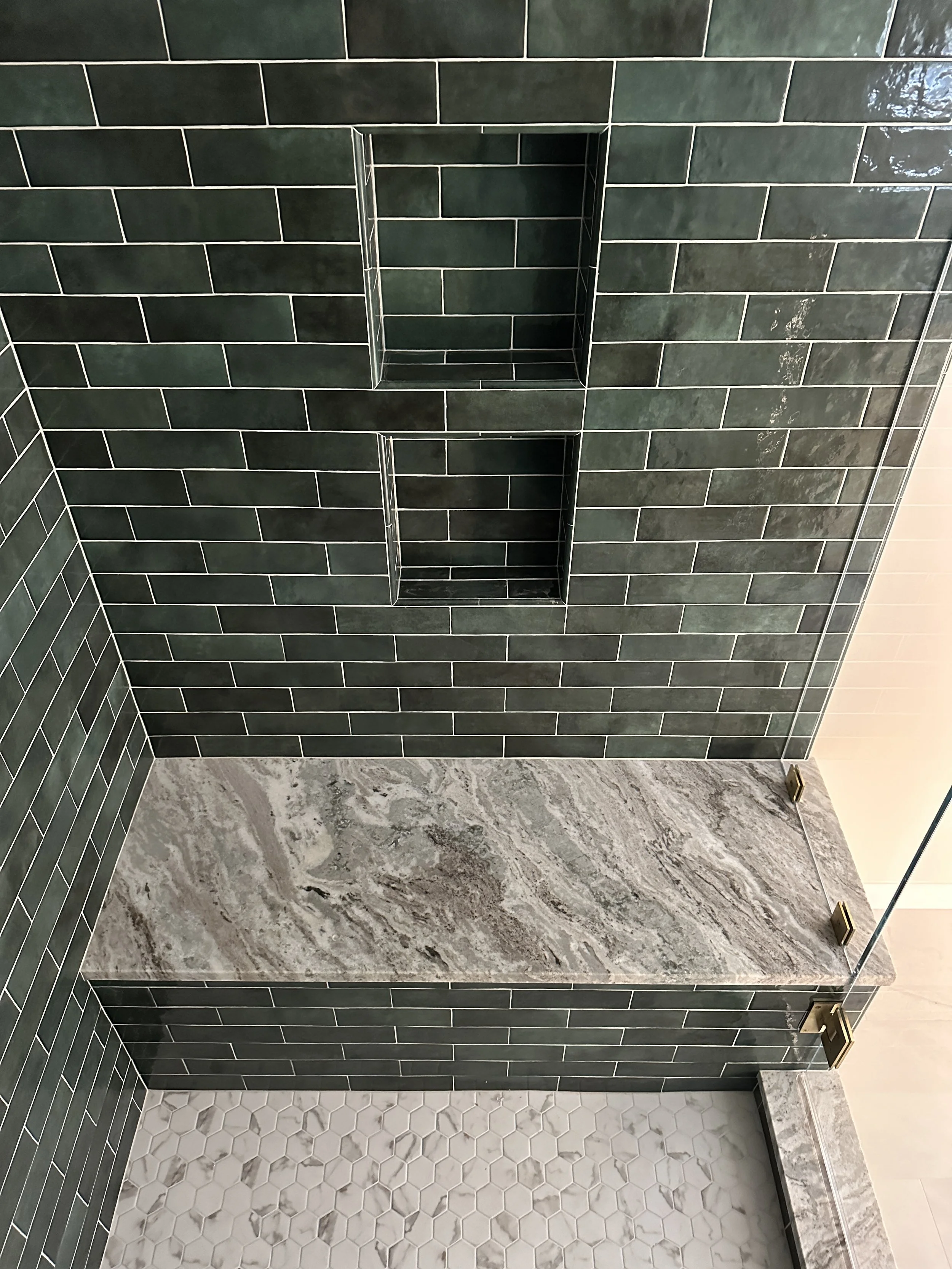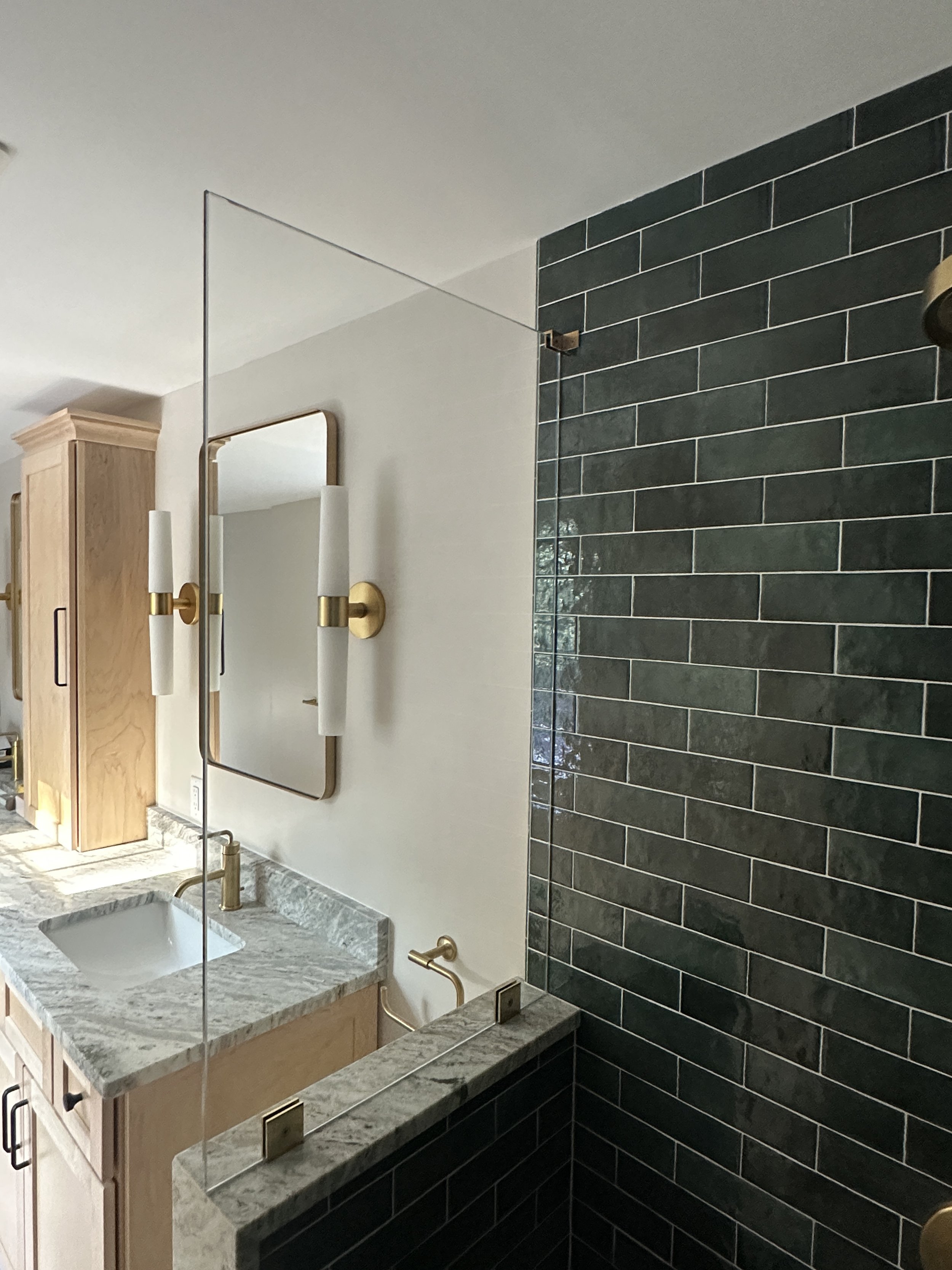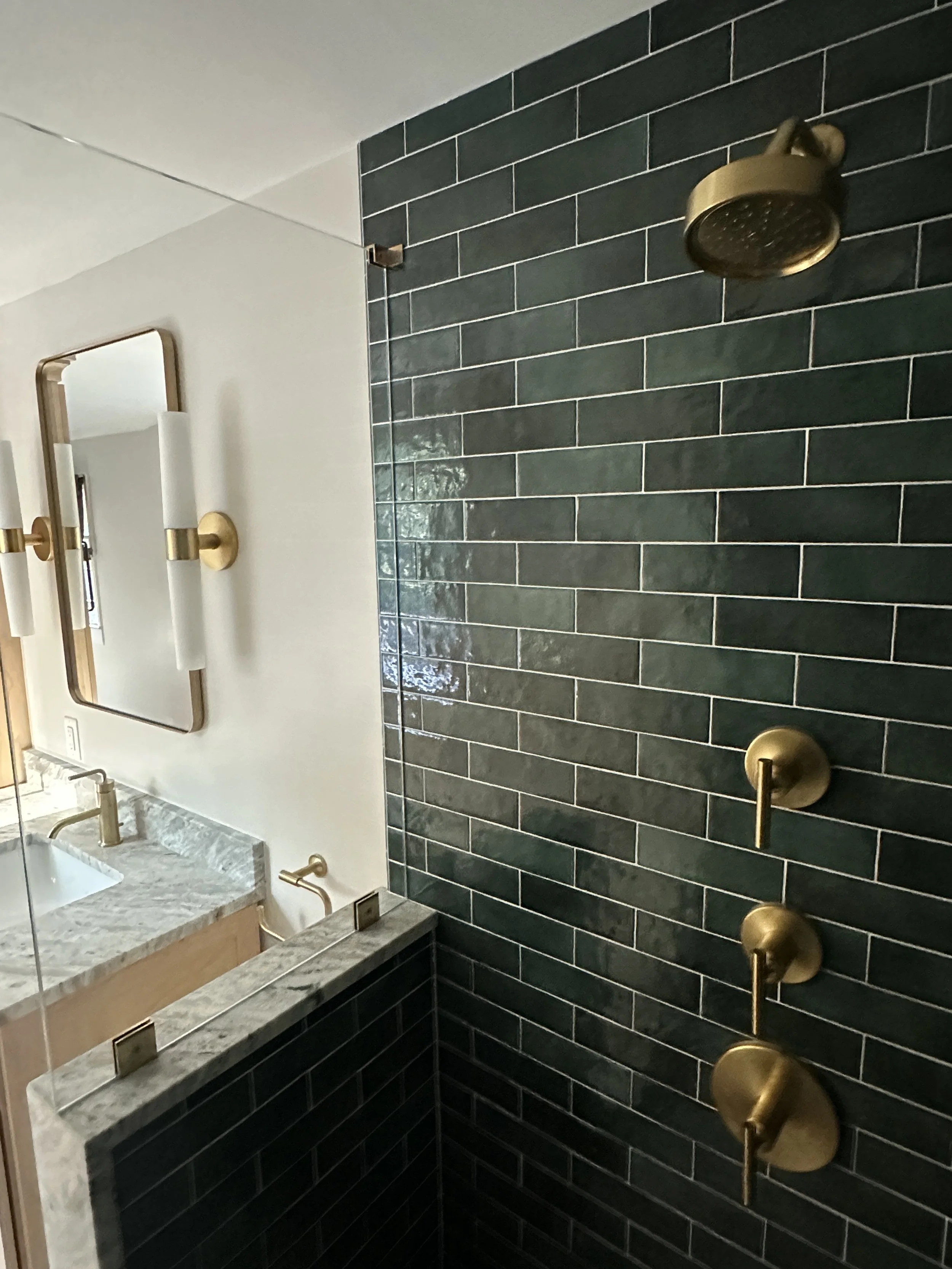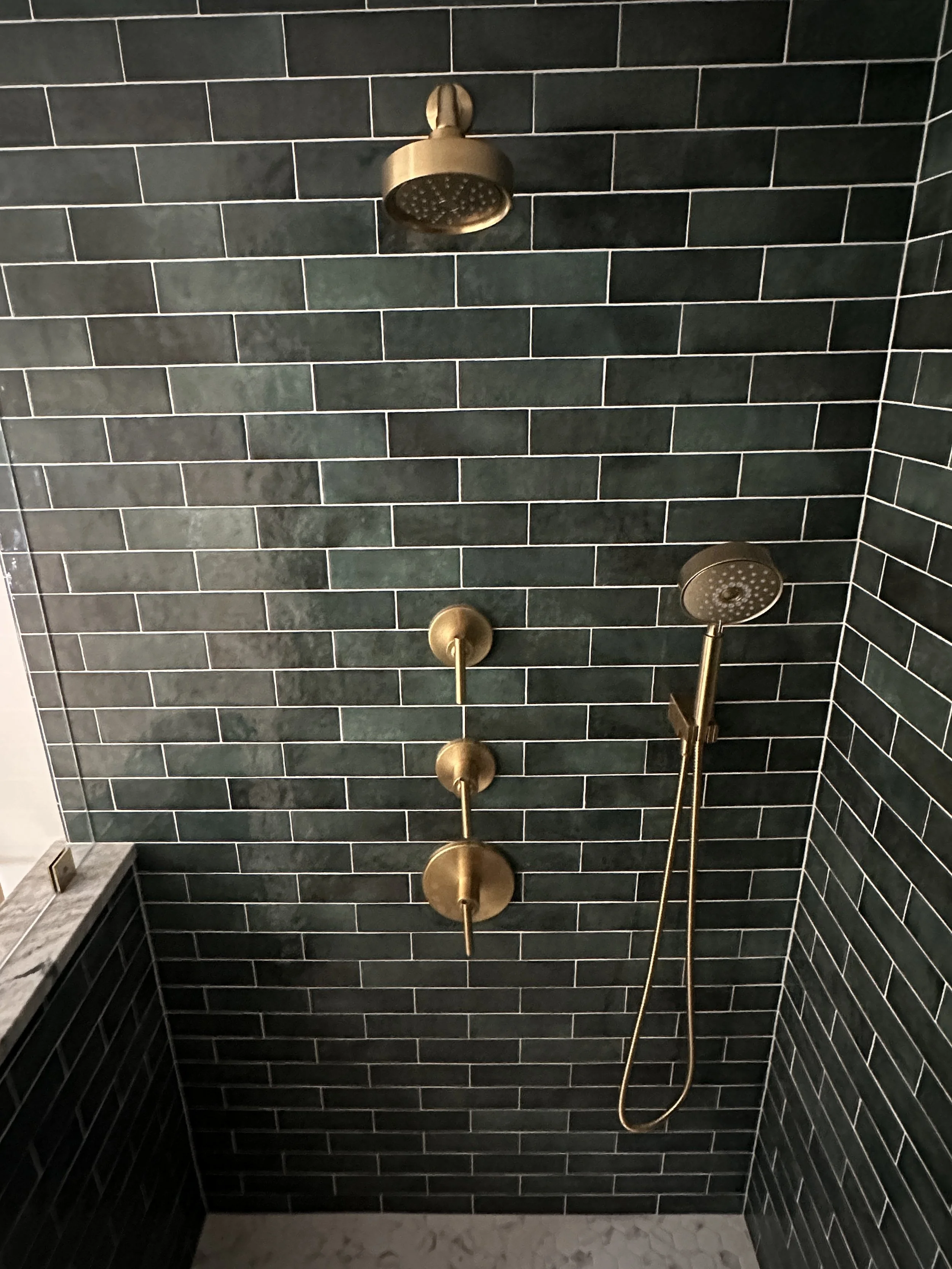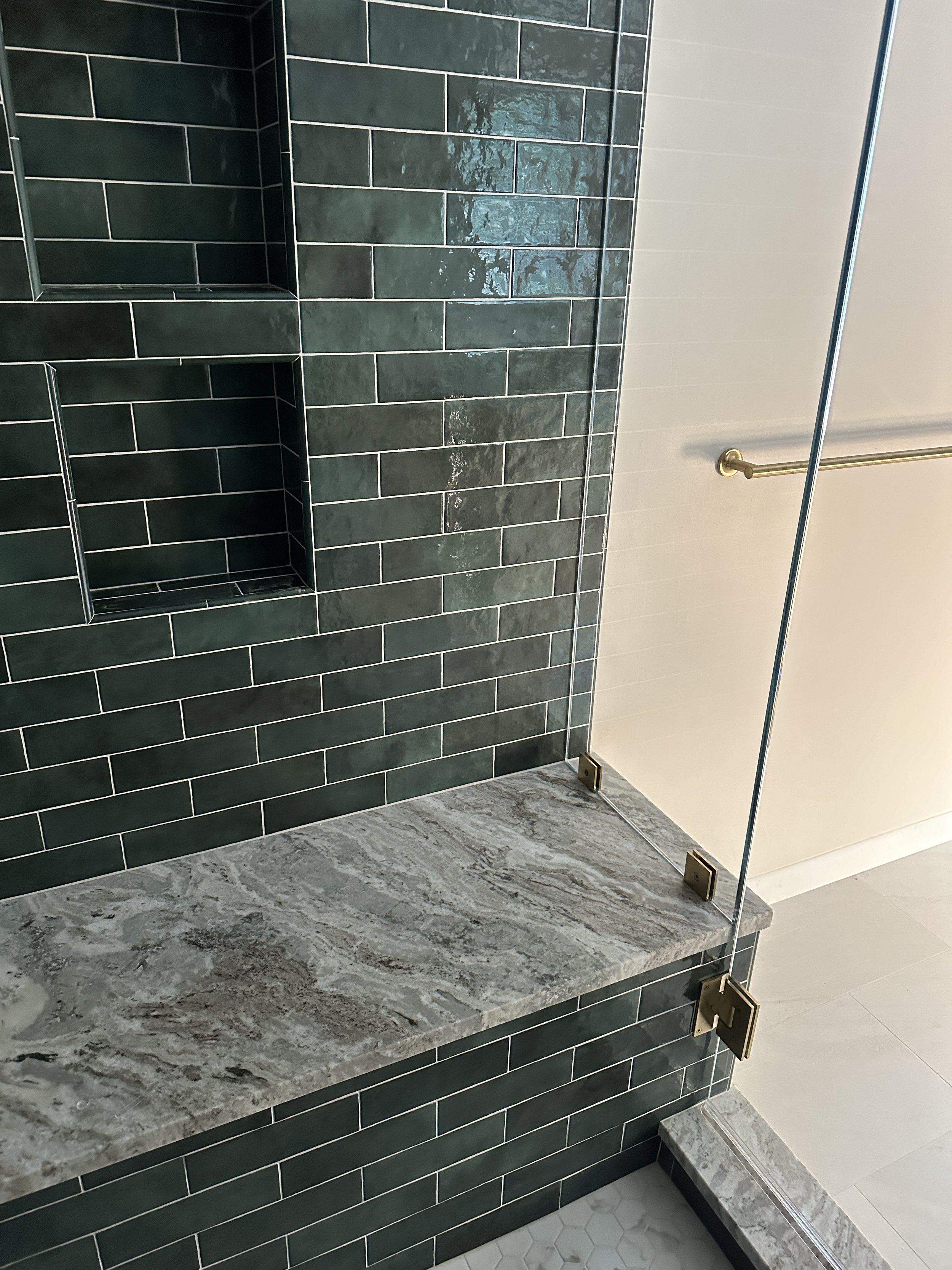 It's wonderful to help homeowners design their primary bathrooms as truly personal spaces. We believe this area should perfectly reflect your individual style and preferences. For this project, which was part of a larger addition to create a primary suite, we converted an existing bedroom into the bathroom. We're particularly excited about how the timeless combination of green and brass has come together to create this stunning shower.