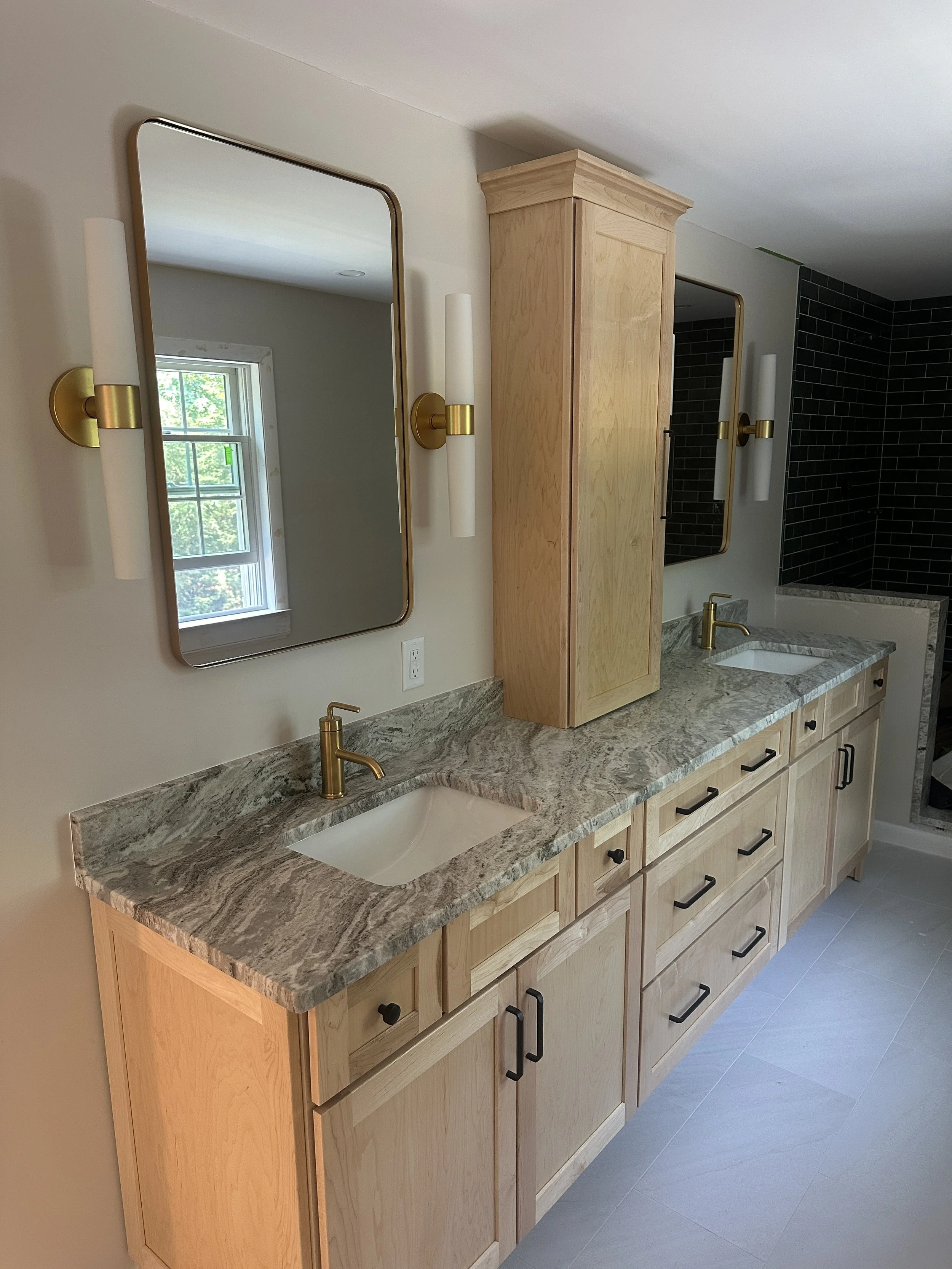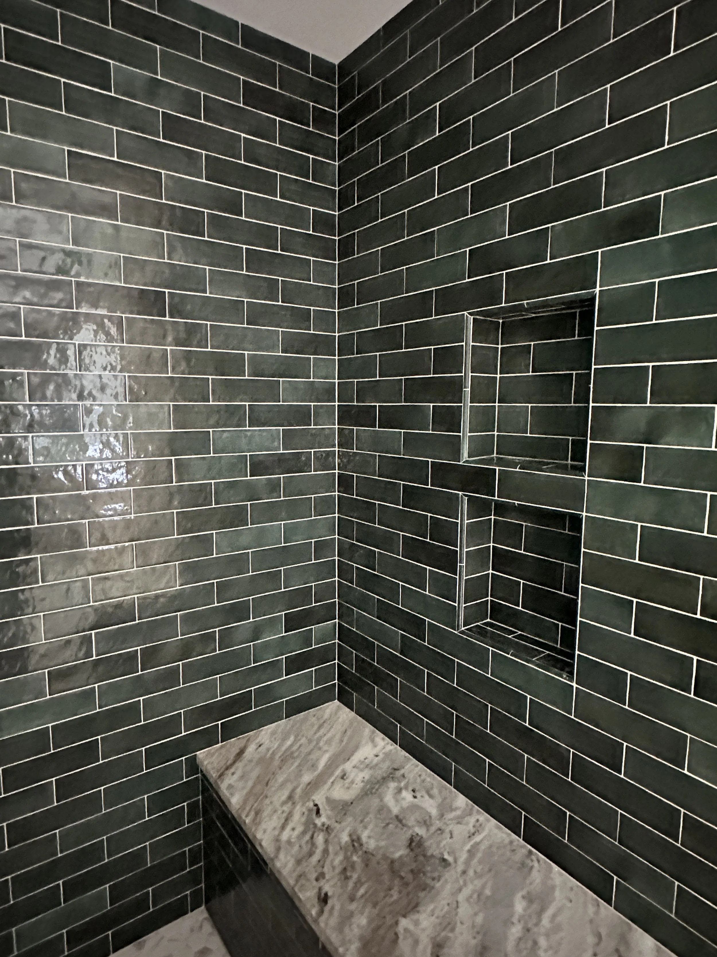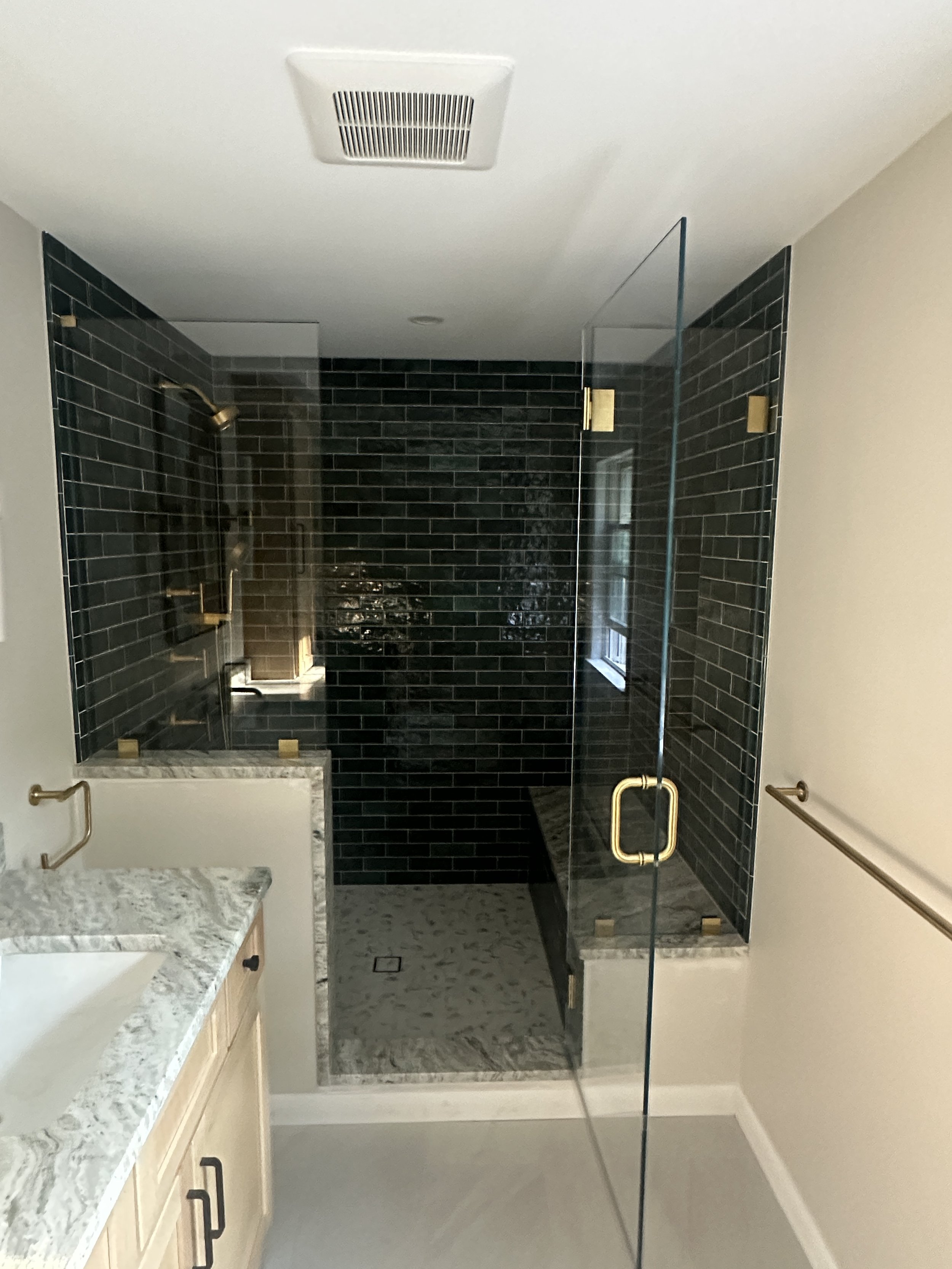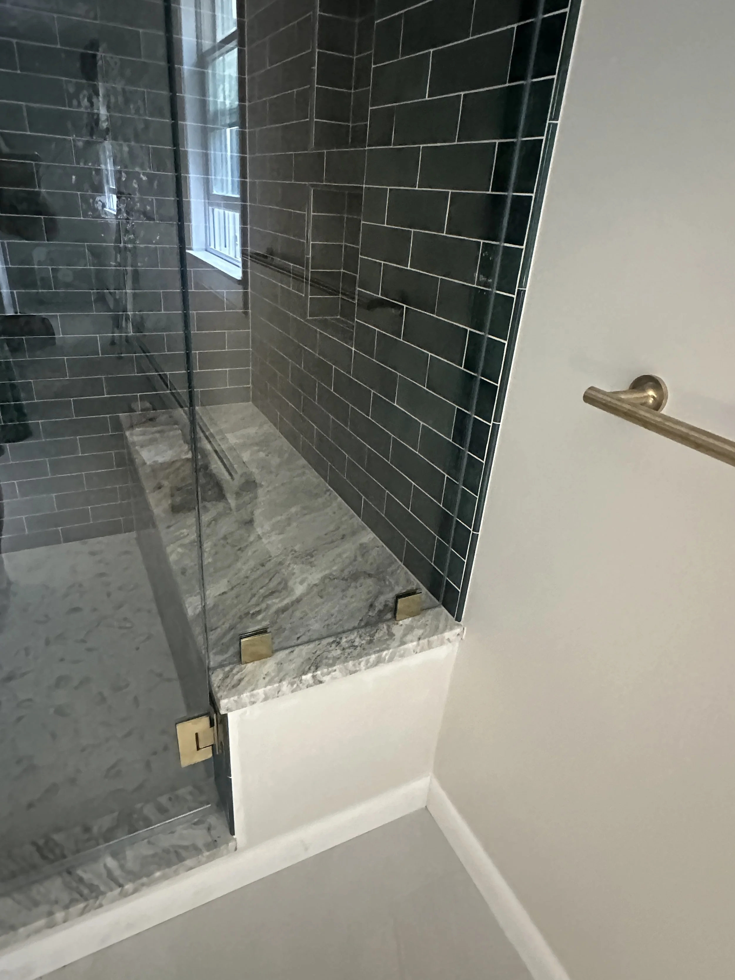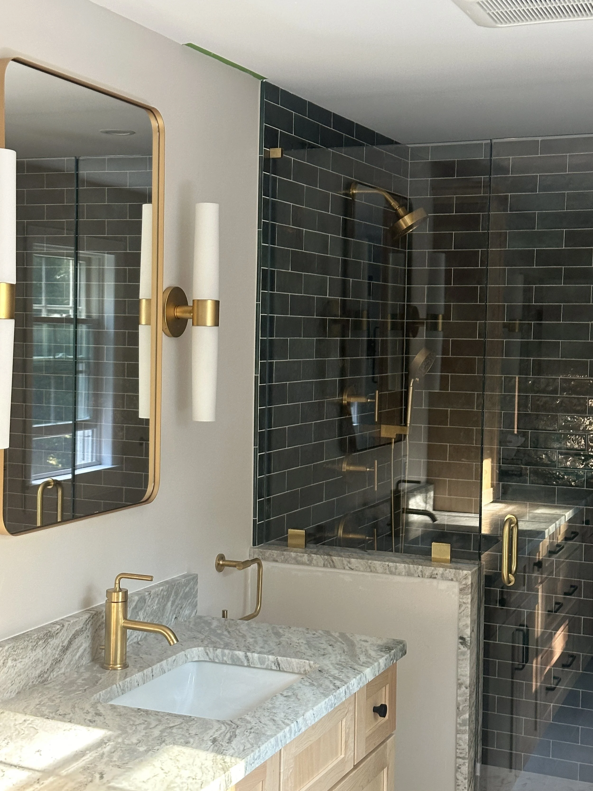 It's wonderful to help homeowners design their primary bathrooms as truly personal spaces. We believe this area should perfectly reflect your individual style and preferences. For this project, which was part of a larger addition to create a primary suite, we converted an existing bedroom into the bathroom. We're particularly excited about how the timeless combination of green and brass has come together to create this stunning shower.